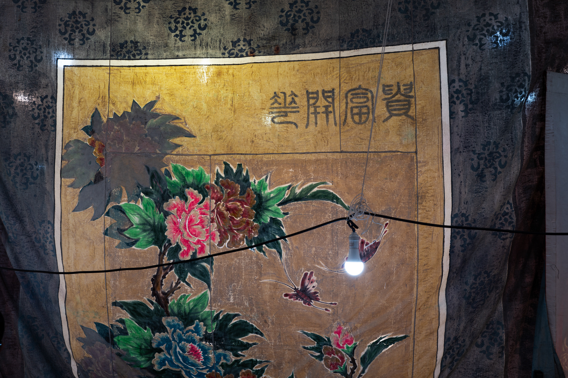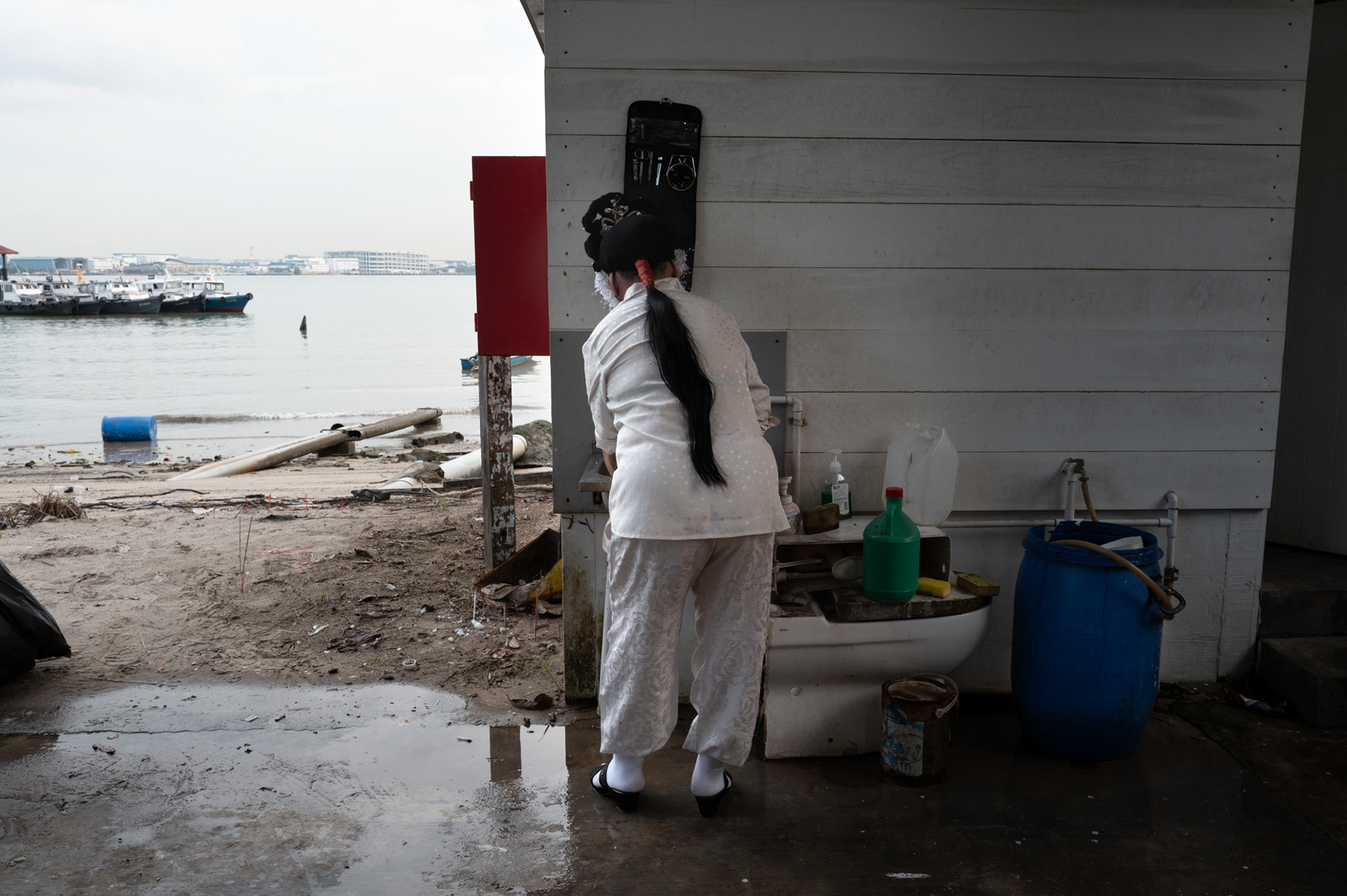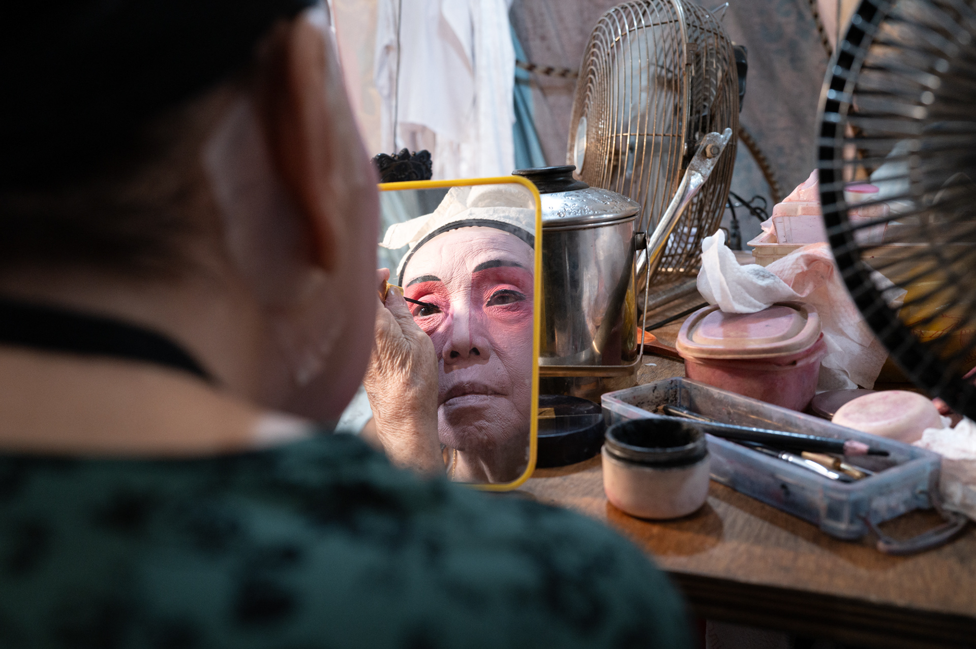 After the bike-riding day trippers have left the island and all the bikes are stacked up high for the night, a small group of actors, musicians and other volunteers transform the atmosphere. Behind-the-scenes, amidst the bustle of preparation, the magic of Chinese opera comes to life. Colourful costumes and elaborate makeup transform ordinary individuals into celestial beings and legendary heroes, each detail resonating with history and reverence. These Chinese opera performances now often play out on temple grounds solely for the deities, observed quietly by a handful of photographers and temple volunteers.